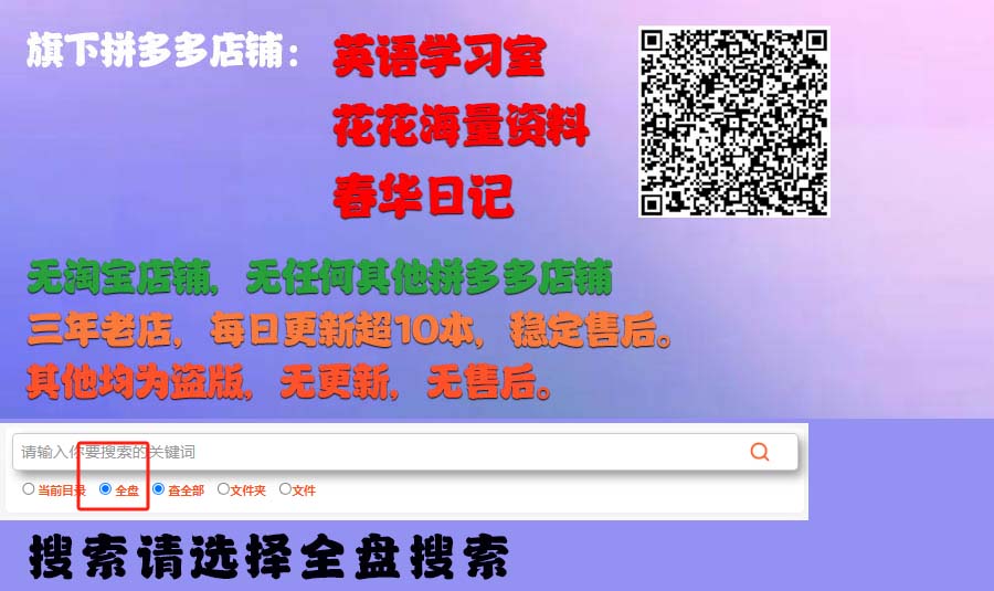 kindle书库旗下只有拼多多店铺:英语学习室。花花海量资料。春华日记,嗨英语资料。其他均为盗版